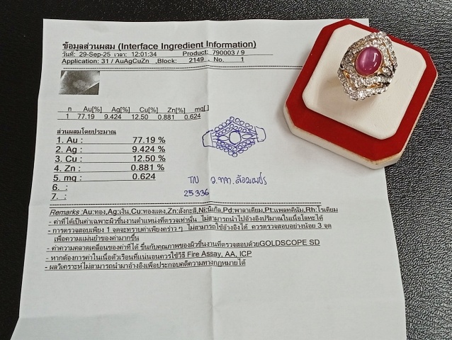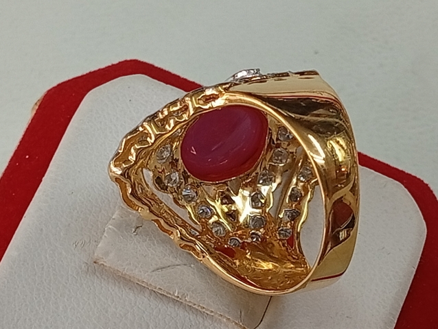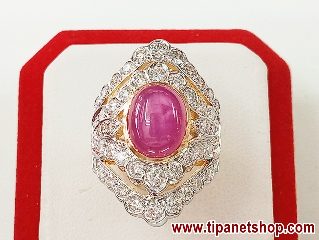 แหวนทอง 77% ทับทิม ทรงหลังเบี้ย มี สตาร์ เหลือบแสงด้านหน้า 5 กะรัต