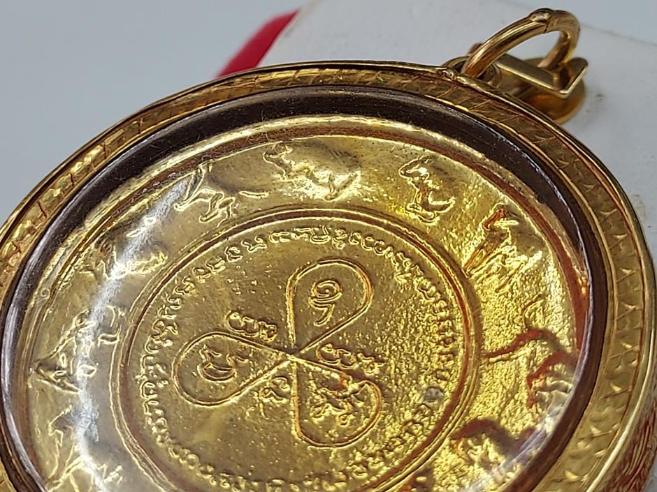 จี้เลี่ยมทอง90 เหรีนญ หลวงพ่อคูณ พื้นลงยาดำ ด้ายหลัง 12 นักษัตร หุ้มทอง จับขอบ มีลาย