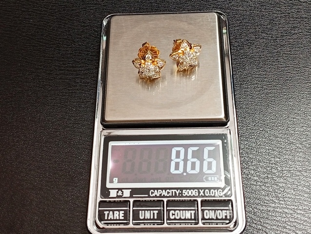 น้ำหนักรวม 8.6 กรัม หน้ากว้าง 1.5 ซม. แป้นต่างหูเรียบ กว้าง 1 ซม.